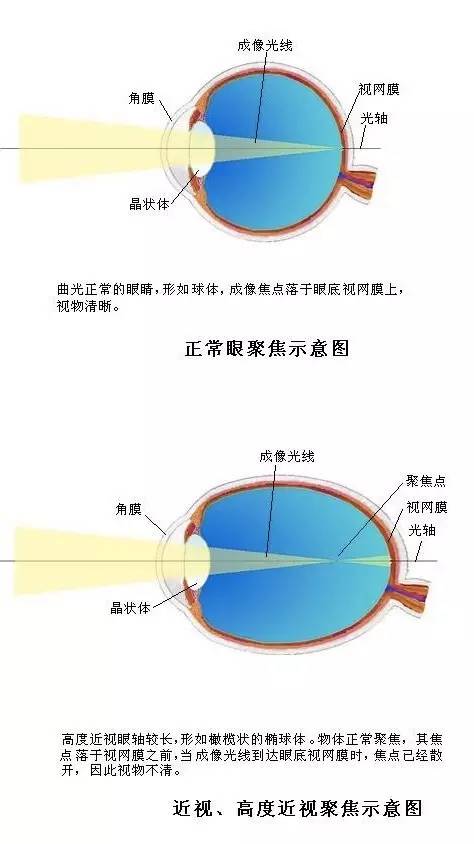 还有的近视,是镜头没变,所以聚焦点的位置没变;但是相机机身变长了(眼轴发育过长),导致应该接收聚焦点信号而成像的眼底视网膜位置往后移了,就对不准焦了。