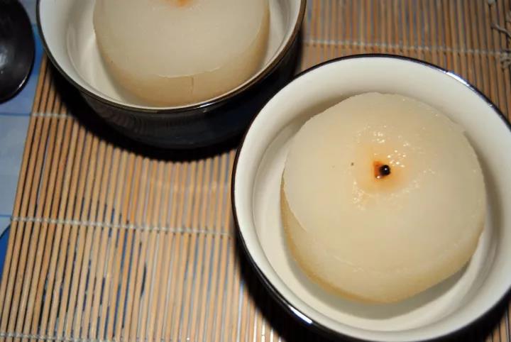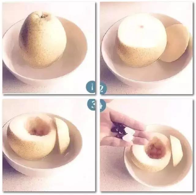 把梨靠柄部横断切开,挖去中间核后放入2-3粒冰糖,5-6粒川贝(川贝要敲碎成末),把梨对拼好放入碗里,上锅蒸30分钟左右即可,分两次服用。