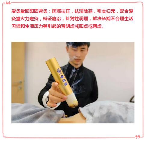爱灸堂回阳固肾灸:匡邪扶正,祛湿除寒,引本归元,配合爱灸堂火力定灸,辩证施治,针对性调理,解决长期不合理生活习惯和生活压力等引起的肾阴虚或阳虚或两虚。