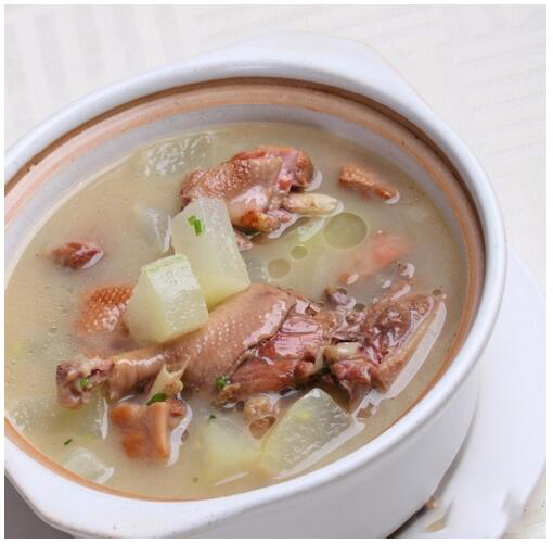 用料:老鸭一只,冬瓜两斤,薏米 20 克,陈皮一片,姜片一片,蜜枣一枚。