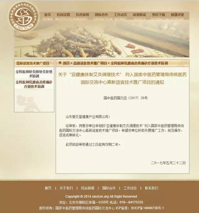 2017年5月,爱灸堂“亚健康体质艾灸调理技术”成为首个亚健康艾灸调理技术的国家标准,被中医药管理局认定为高新适宜推广项目。