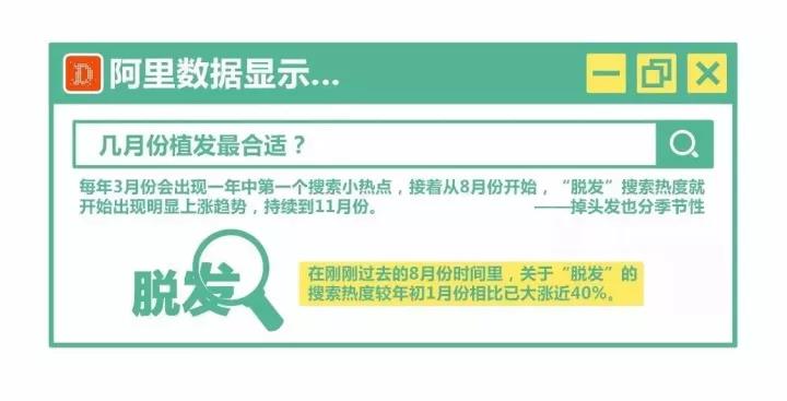 阿里数据显示,对植发、护发产品的搜索,在一年中会呈现规律性变化趋势:每年3月份将出现全年中第一个小高潮,接着从8月份开始,「脱发」一词的搜索热度就会出现明显上涨趋势,一直持续到11月份。