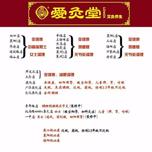 爱灸堂专注专业艾灸15年,在烟台开了26家门店,倡导中医传统养生方式,用艾灸调理除了脾胃调理(慢性胃炎、腹泻)外,还有白领及成功人士亚健康,风寒湿,颈腰腿关节炎,过敏性鼻炎,男士(通风、前列腺、回阳固肾),女士(暖宫助孕、妇科炎症),儿童(脾、胃、咳嗽),中老年降三高,各类慢性病等。