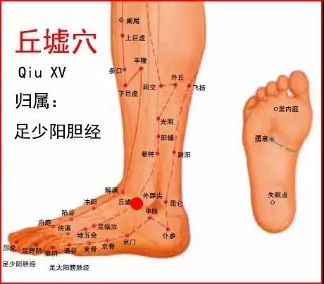 《甲乙经》:目视不明,振寒,目翳,瞳子不见,腰两胁痛,脚酸转筋,丘墟主之。