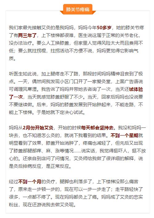 膝关节疼两三年(慢病),试体验一次,2月份开始艾灸,每天都会坚持去,不到一个星期,不到一个月。