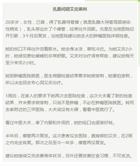 1:艾灸时,乳房周围蚁行感明显,结束艾灸后蚁行感会持续很长时间;乳房肿块明显感觉在慢慢变小!