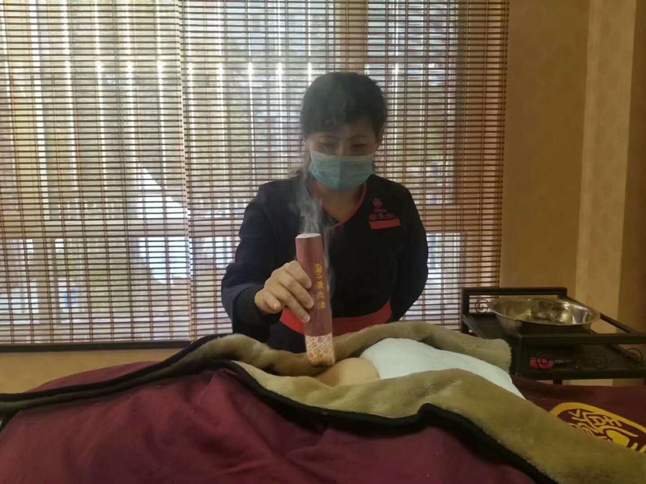 艾灸师正在为顾客做艾灸 爱灸堂 调病、保健、养生、美容, 样样行!