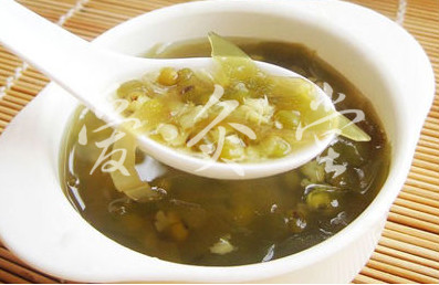 治疗:将绿豆、薏米浸泡三小时,海带切条状。把绿豆、薏米、海带放入锅中,加入清水,炖煮至熟,加红糖调味即可。