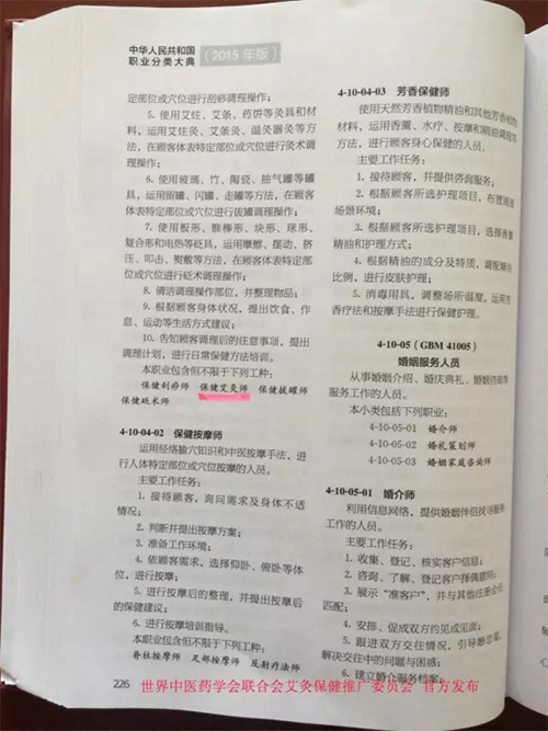 国家职业分类大典修订工作委员会近日审议并颁布2015版《中华人民共和国职业分类大典》(以下简称《大典》)。中医行业新增9个职业,中医药工作重要性进一步凸显,新版《大典》中还进一步完善了中医行业特有工种,如保健艾灸师。保健艾灸师作为新职业正式纳入《大典》,标志着其职业身份在“国家确定职业分类”上首次得以确认。