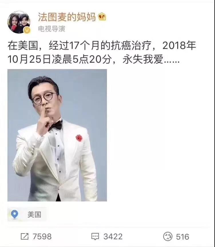 那个陪我们一起「砸金蛋」主持人永远地离开了。 今天早上 9 点 31 分李咏的妻子@法图麦的妈妈 发文:在美国,经过 17 个月的抗癌治疗,2018 年 10 月 25 日凌晨 5 点 20分 ,永失我爱……